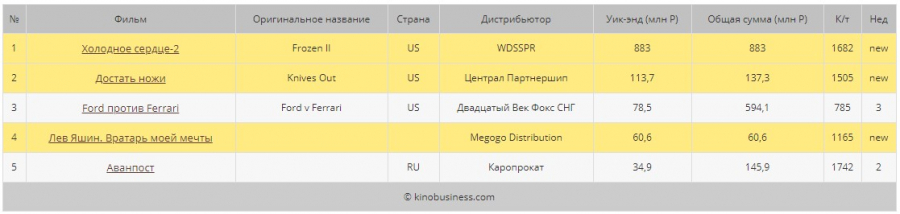 Первый российский уикенд мультфильма принес ему 883 млн рублей. На втором месте еще одна американская картина «Достать ножи», она ощутимо отстала от лидера, заработав 113,7 млн рублей. Спортивная драма «Ford против Ferrari» оказалась на третьем месте со сборами в 78,5 млн рублей.