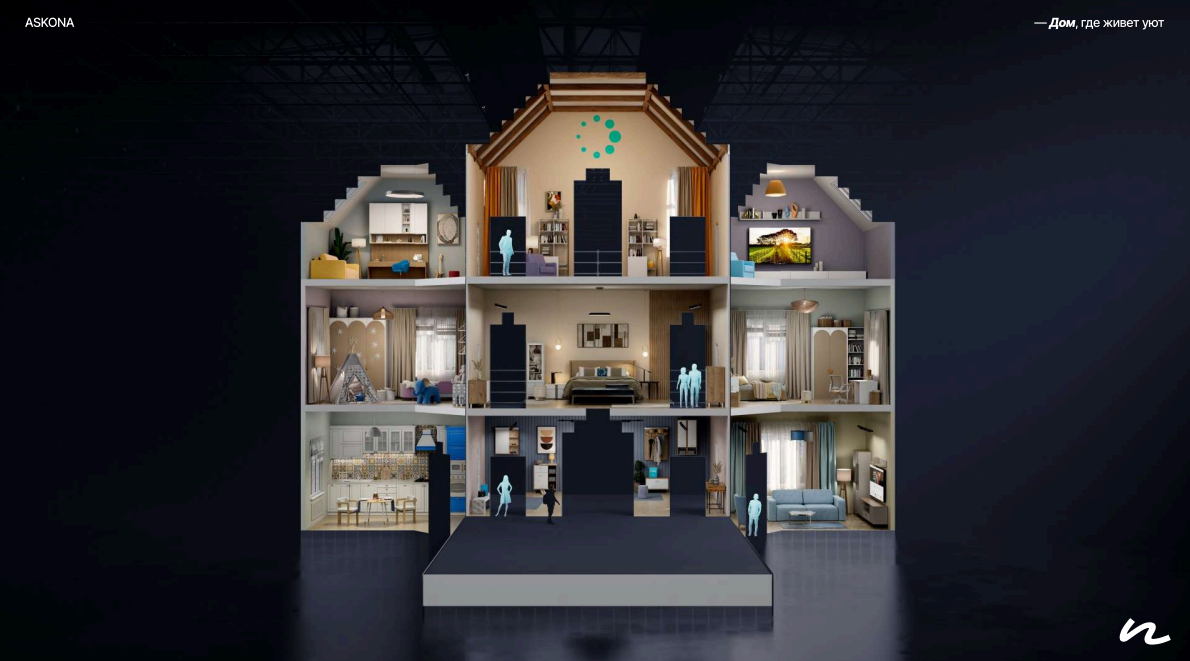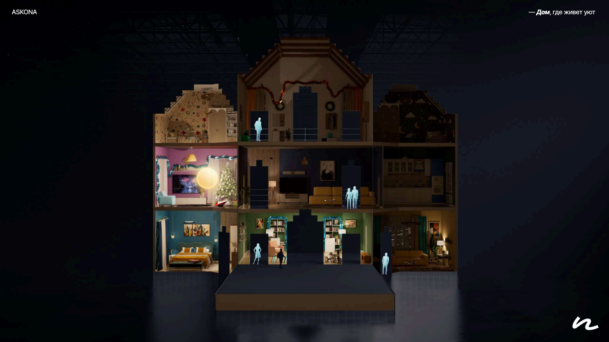 Прямо на ледовой сцене был воссоздан трехэтажный дом Askona, где в пространстве 9 комнат обыгрывались сцены из жизни семей, переехавших в новый дом. Все комнаты были обставлены реальной мебелью из ассортимента Askona Home: детские гарнитуры, стеллажи с игрушками и шкафы с одеждой, тумбочки, кровати с постельным бельем, кухонная мебель — всего более 100 актуальных товаров. В режиме реального времени дом буквально оживал с появлением нового декора и аксессуаров: на полках появлялись книги, на полу расстилались ковры, а стол сервировался к приходу гостей. Магия преображения дома поддерживалась уникальным музыкальным сопровождением и закадровым актерским текстом: