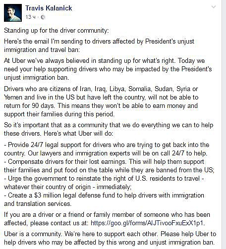 Обеспокоенность IT-индустрии можно понять: компании из Силиконовой долины являются крупными работодателями и заинтересованы в привлечении талантливых специалистов из самых разных стран. Глава Uber Трэвис Каланик заявил, что запрет затронет многих неповинных людей, и пообещал поднять этот вопрос на совещании в Белом доме. При этом сервис едва не поплатился за решение обслуживать аэропорт Джона Кеннеди в Нью-Йорке, в то время как местный альянс таксистов объявил забастовку. Пользователи начали удалять приложение и делиться скриншотами с хэштегом #DeleteUber, после чего Каланик пообещал оказывать круглосуточную юридическую помощь водителям, которые оказались за пределами США и пытаются вернуться в страну, а также компенсировать им упущенные заработки. Всего на юрпомощь Uber выделит 3 млн долларов.
