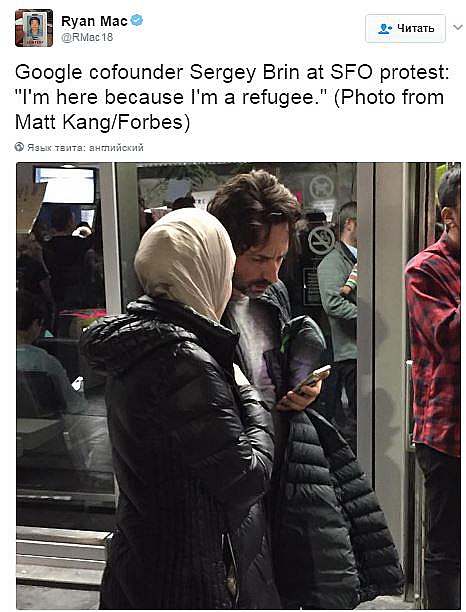 К протестующим в аэропорту Сан-Франциско присоединился сооснователь Google и президент холдинга Alphabet Сергей Брин. Журналисту Forbes он заявил, что пришел как частное лицо: «Я здесь потому, что я беженец». Накануне гендиректор Google Сундар Пичаи попросил сотрудников, которые находятся за пределами США, вернуться в страну. В его письме говорилось, что указ может затронуть около 100 человек.