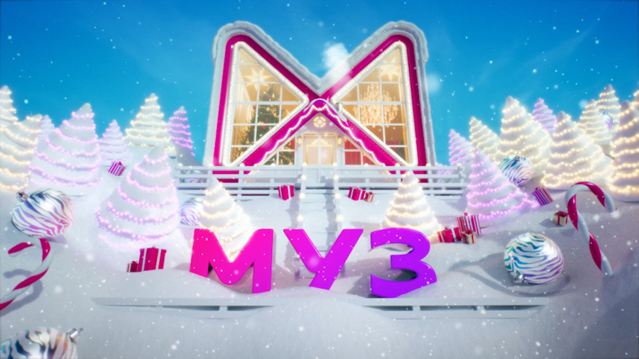 Эфир украшает бесконечная графическая ёлка из подарков с авторской коллекцией новогодних шариков в ментоловых и фиолетовых оттенках.