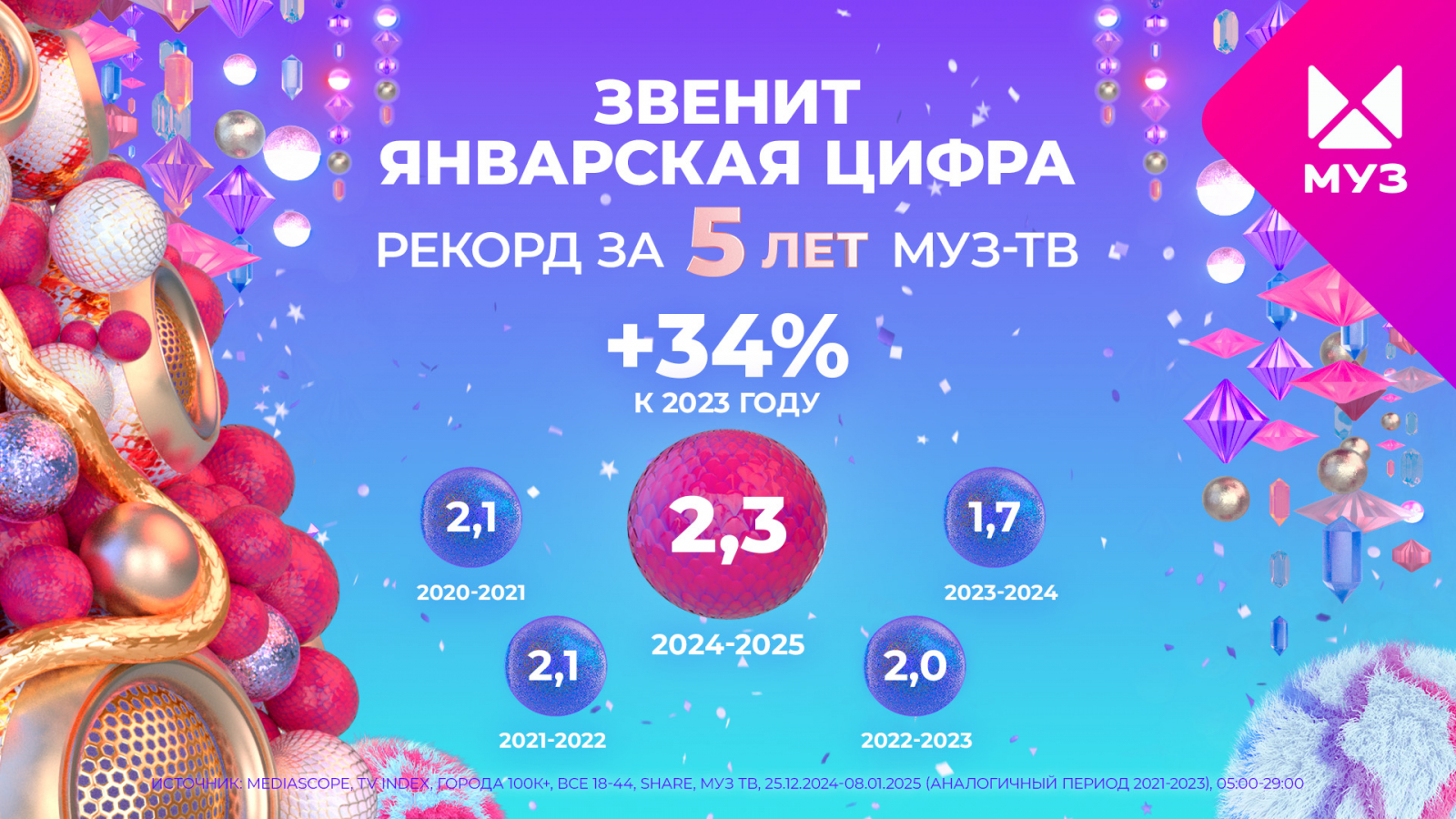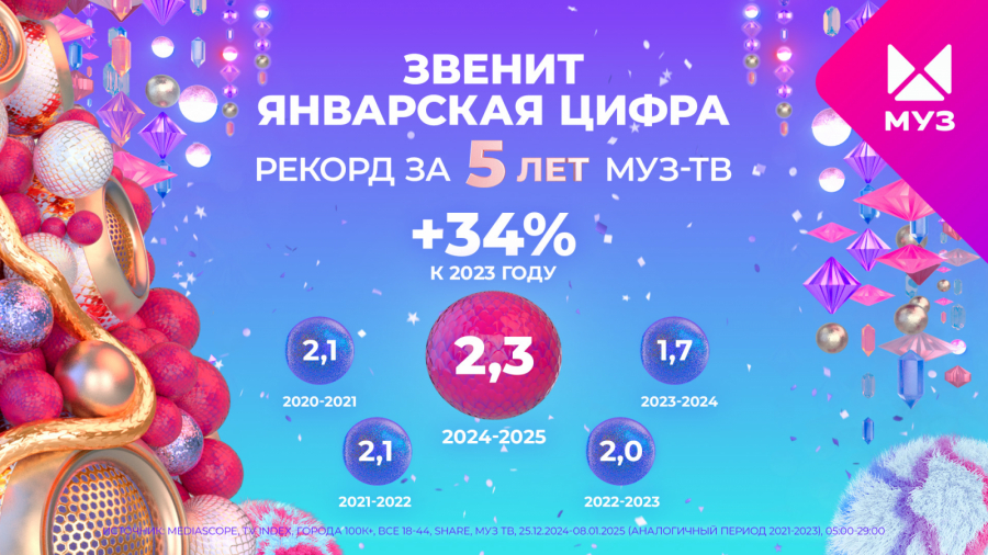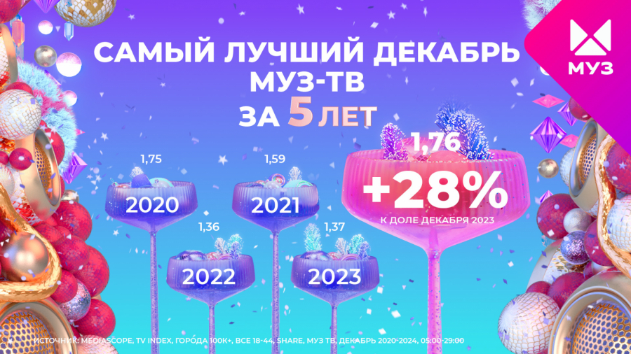Новогодняя ночь и новогодние каникулы на «МУЗ-ТВ», включая последнюю неделю декабря, составили рекордную долю канала за 5 лет, прибавив 34% к доле 2023/2024 по данным Mediascope, а совокупный охват музыкального телеканала составил 26,9 млн зрителей.