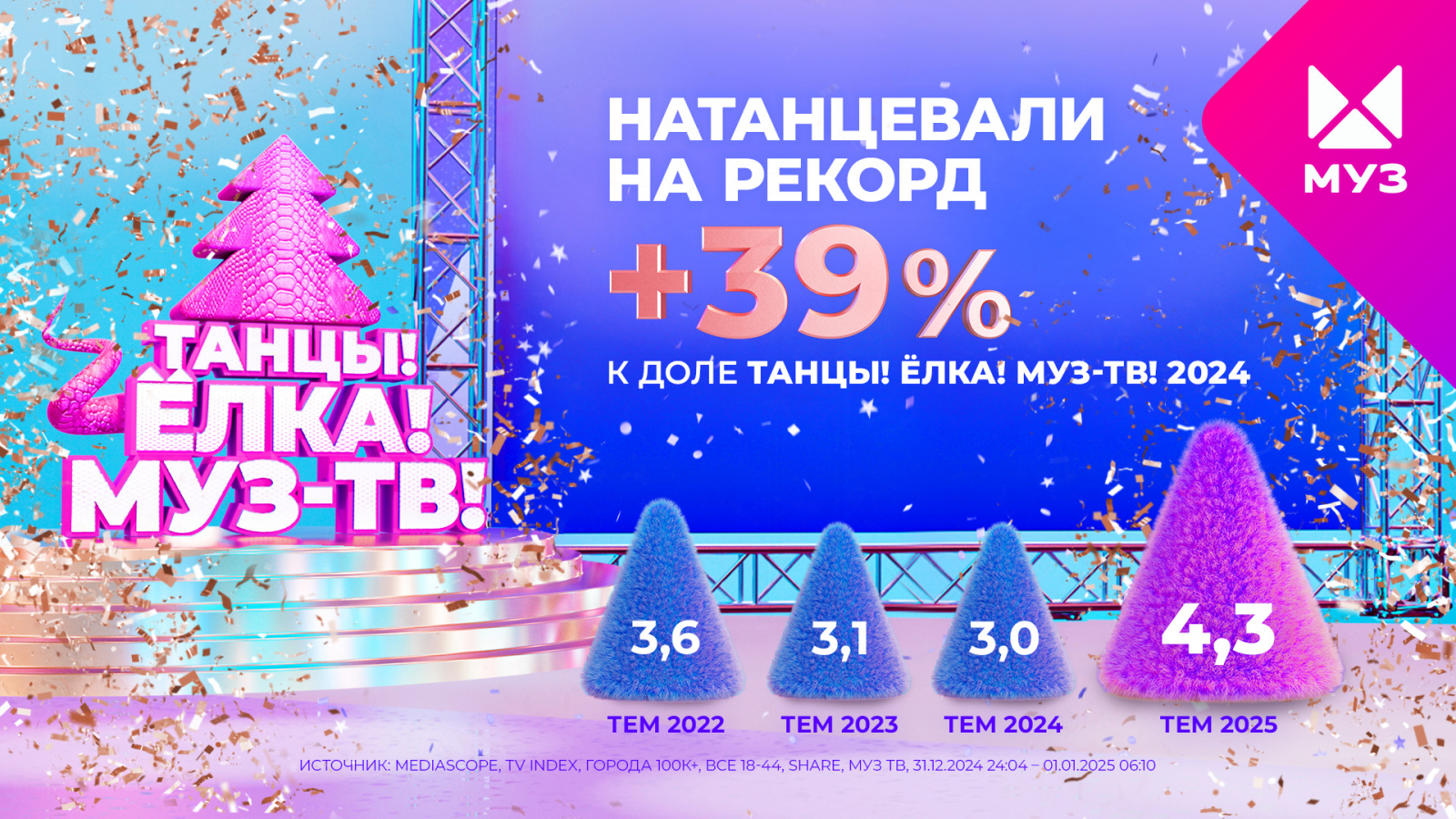 Также, согласно данным Mediascope, новогодняя дискотека «Танцы! Ёлка! МУЗ-ТВ!» стала самой востребованной за последние 4 года у аудитории в возрасте от 18 до 44 лет: впервые зрители «натанцевали» на показатели в 4,3 доли, превысив на 39% долю 2024 года, а среди молодых девушек в возрасте от 18 до 30 лет «МУЗ-ТВ» вошел в ТОП-5 федеральных каналов.