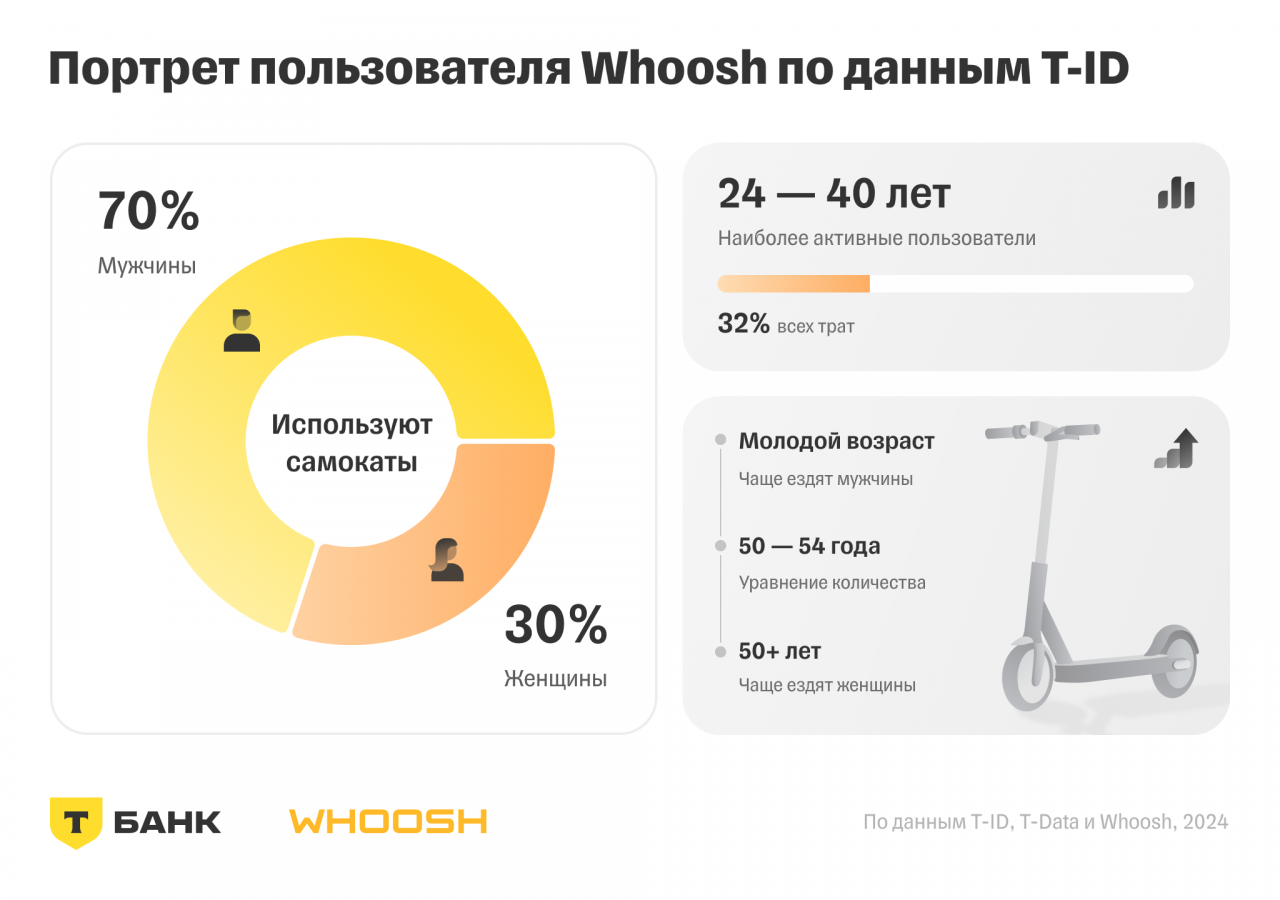 В молодом возрасте на электросамокатах чаще ездят мужчины, а в пожилом — женщины. Уравнение количества мужчин и женщин, пользующихся самокатами, происходит в 50−54 года. Об этом говорится в исследовании сервиса кикшеринга Whoosh и сервиса авторизации «T-ID» от «Т-Банка». Отчет есть в распоряжении Sostav.