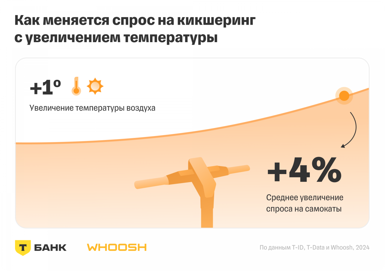 С наступлением тепла люди чаще пользуются самокатами: при увеличении температуры летом на 1 градус спрос на средства передвижения в среднем повышается на 4%.