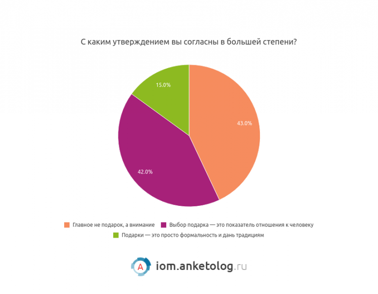 Оказалось, что с расхожей фразой «главное не подарок, а внимание» согласны менее половины россиян — 43%. Еще 42% относятся к выборку подарка серьезнее и считают, что это демонстрирует отношение к человеку.