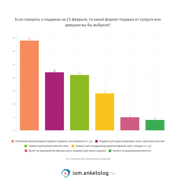 Наиболее желанным подарком к 23-му февраля большая часть мужчин (34%) назвала полезные вещи, например, инструменты или гаджеты. Подарок для души, например, игру или приятную мелочь, выбрали 22%, совместный романтический ужин — 21%.