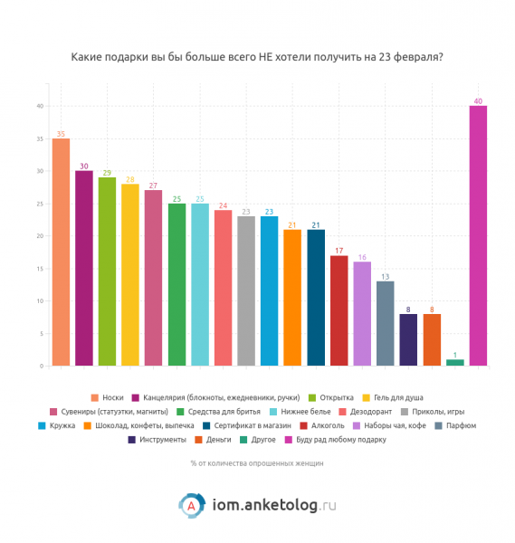 Среди нежелательных подарков мужчины также назвали канцелярию (30%) и открытки (29%). 42% женщин также считают плохими подарками канцелярию, а 42% против мягких игрушек.