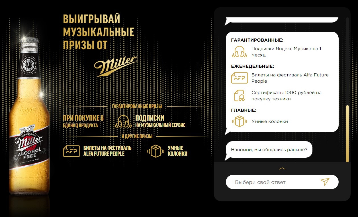Affect Group) стояла задача реализовать национальную промокампанию Miller. Интерес к промо среди молодой аудитории продолжает падать, поэтому агентство предложило максимально нативный для современных потребителей формат — регистрацию чеков через бота, доступного как на сайте, так и в мессенджерах. Так появился музыкальный промобот Miler.