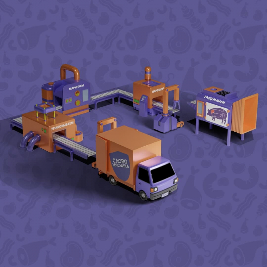 Мы создали уникального виртуального мясника, основываясь на существующем образе персонажа бренда, проработали подробные сценарии, максимально погружающие пользователя в производство продукции, отрисовали завод и все объекты таким образом, чтобы все элементы AR максимально отражали реальный процесс.