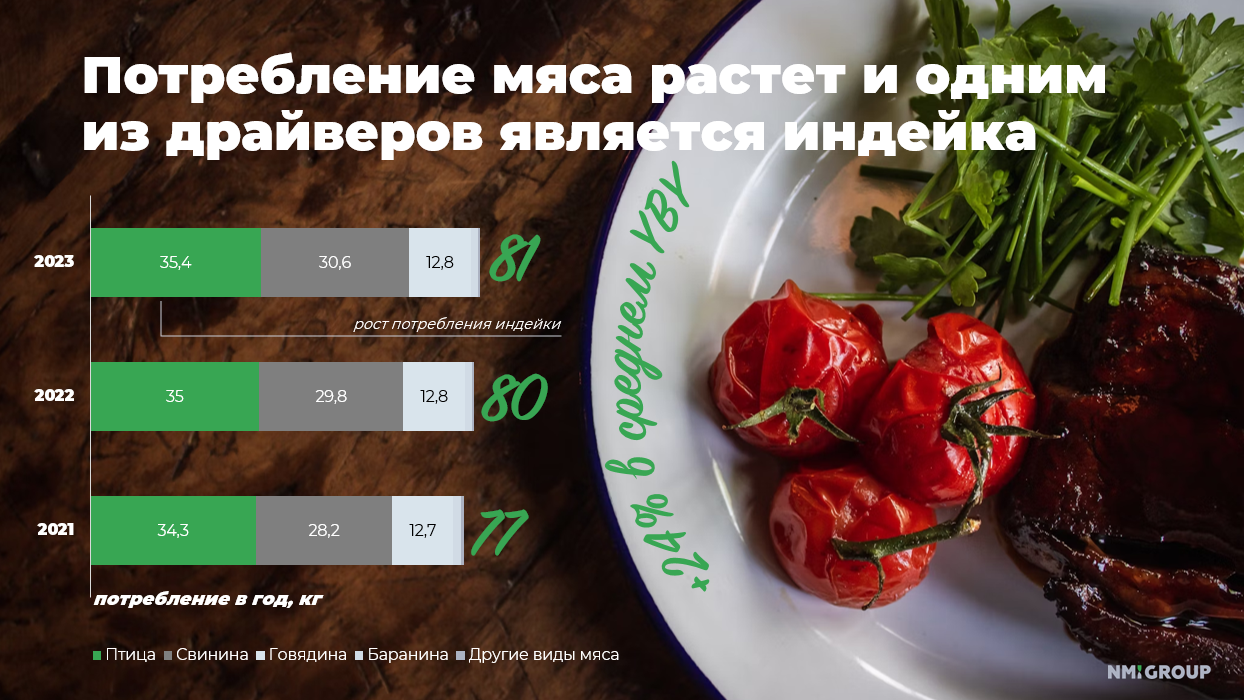 В России растёт потребление мяса. В 2021 году один человек съедал в год 77 кг мяса, в 2022 году — 80 кг, в 2023-м — 81 кг. Одним из драйверов роста потребления мяса является индейка. Такие данные содержатся в исследовании NMi Group, которое есть в распоряжении Sostav.