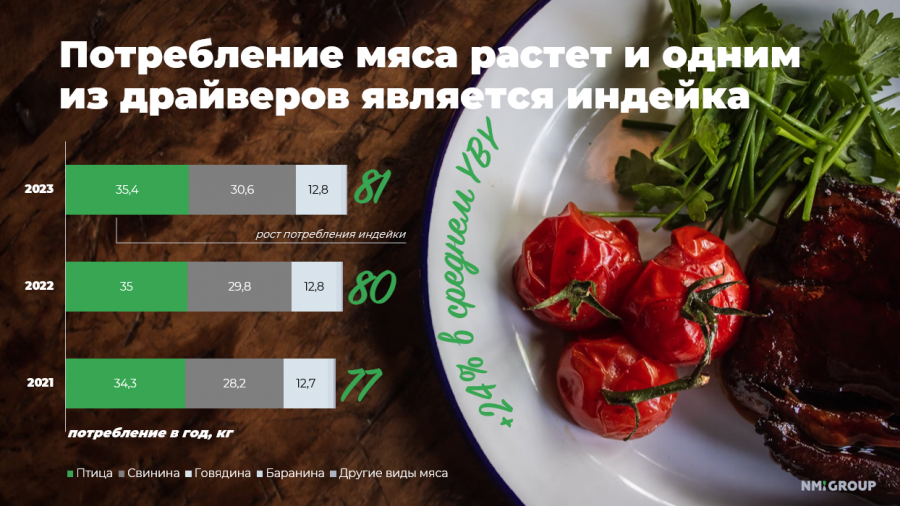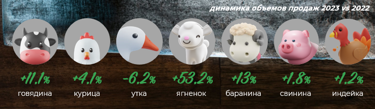 Мясо и мясные изделия занимают 31% в структуре продаж FMCG (товаров повседневного спроса). В 2023 году продажи мяса выросли на 3,8% год к году, колбасы — на 4,4%. Так, продажи ягнёнка увеличились на 53,2%, баранины — на 13%, говядины — на 11,1%, курицы — на 4,1%, свинины — на 1,8%, индейки — на 1,2%. Продажи утки сократились на 6,2%.