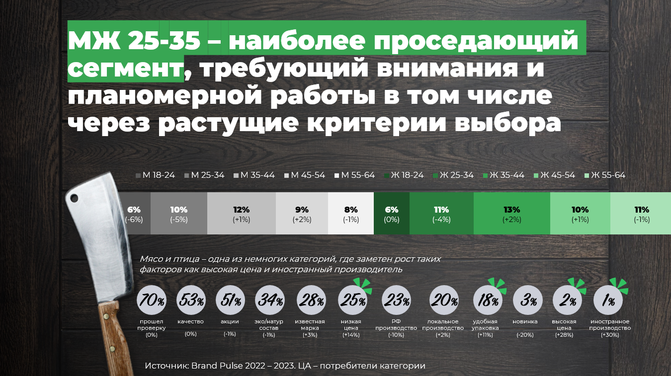 В основном мясо покупают мужчины и женщины в возрасте 35−44 лет (их доля составляет 12% и 13% соответственно). Главные критерии при выборе продукции: товар прошёл проверку (об этом заявили 70% респондентов), качество (53%), акции (51%), натуральный состав (34%), известная марка (28%), низкая цена (25%).
