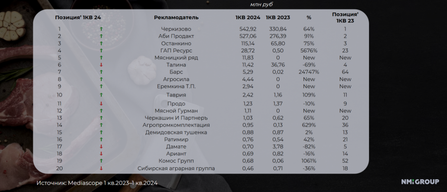 На рынке рекламодателей отмечается появление новых и усиление позиций локальных игроков. В топ-5 рекламодателей входят «Черкизово», «Аби Продакт», «Останкино», «ГАП Ресурс», «Мясницкий ряд».