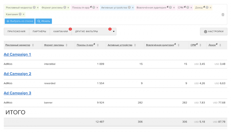 Вся доступная статистика будет отображаться в «Конструкторе отчетов». Чтобы получать данные из AdMob, необходимо воспользоваться методами по отслеживанию данных из медиатора на уровне SDK согласно документации на сайте myTracker.