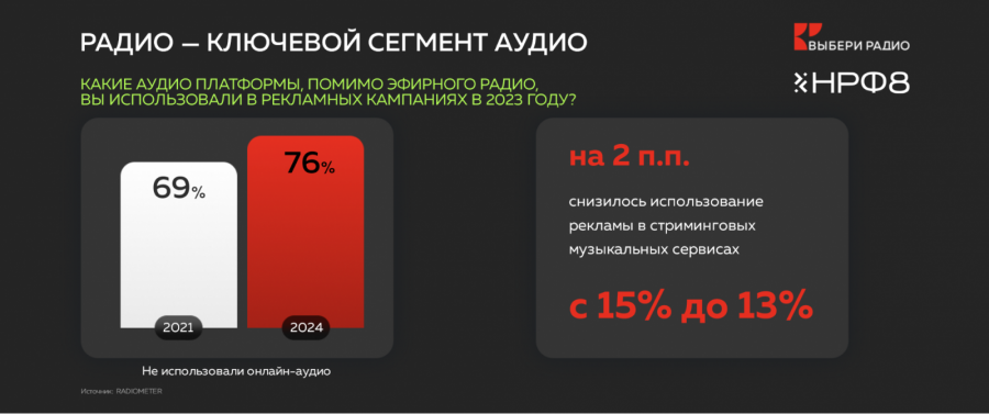 Радио не только остается ключевым сегментом аудио-рекламы, но и укрепляется в этой роли. Согласно данным исследования Radiometer 2024, количество рекламодателей, не включающих онлайн-аудио в свой медиамикс, увеличилось на 7 п.п. по сравнению с данными 2021 года, тогда как популярность использования стриминговых сервисов также сократилось на 2 п.п.