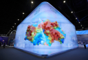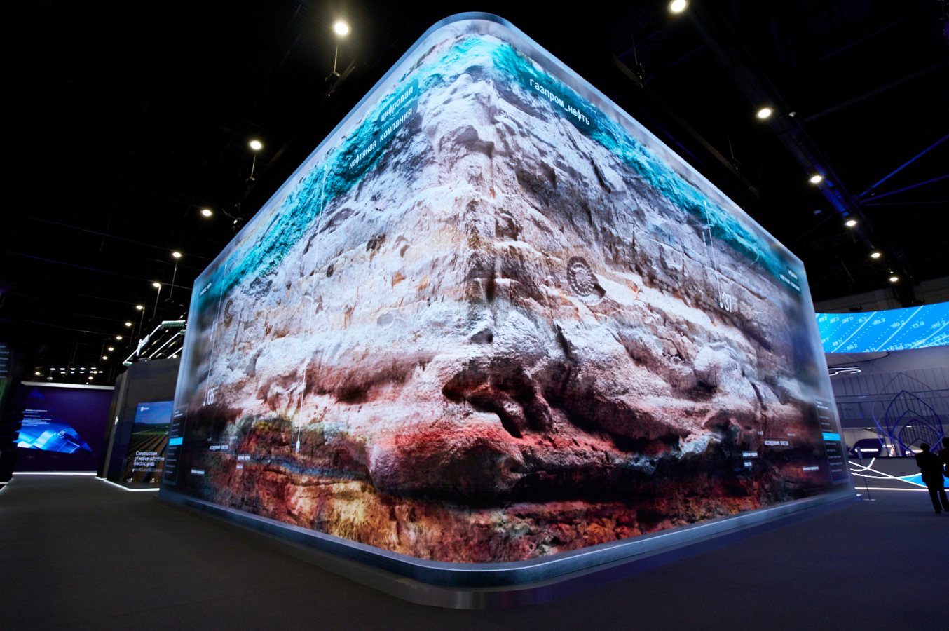 Для стенда был построен огромный 30-метровый экран, на котором можно увидеть эволюцию ландшафтов, сотни оттенков горных пород и древние окаменелости. Геологические образцы представлены в мельчайших деталях. Все это — результат обработки больших объемов данных и работы современных технологий компьютерной графики.