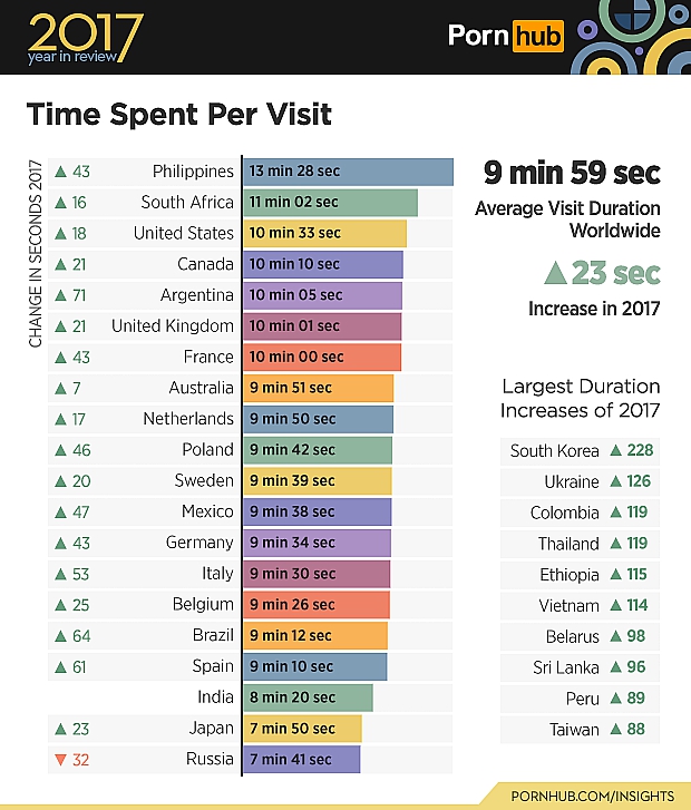 Пользователи и партнеры Pornhub загрузили 4 млн видеороликов в 2017 году, включая 810 тысяч любительских. Это больше, чем туристический поток Великой Китайской стены, отмечают авторы обзора. По подсчетам площадки, за год было загружено 595482 часов контента — для его просмотра потребуется 68 лет.