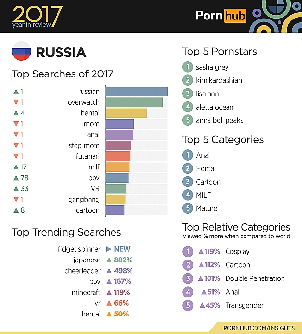 Отдельной статистики удостоилась Россия, которая занимает 18 место по трафику и замыкает TOP-20 по времени, проведенному на сайте. Чаще всего российские пользователи Pornhub искали «русских», overwatch и «хентай».