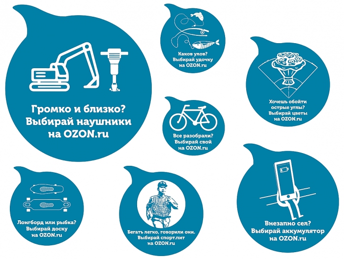 По словам менеджера специальных проектов OZON.ru Татьяны Сигачевой, для интернет-магазина было важно развиртуализироваться, найти «свой» голос в реальном мире, чтобы и интегрировать интернет-покупки в жизнь потребителей.