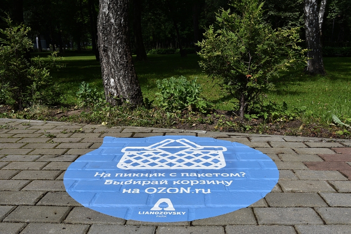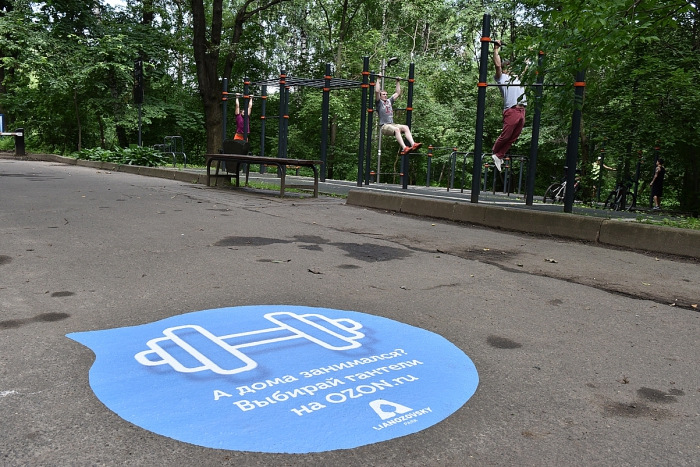 Так, рядом со стоянкой велопроката OZON.ru рекомендует горожанам приобрести велосипед, в подходящем для пикника месте появляется сообщение о красивых корзинках для продуктов «как в кино», на воркаут-площадке советует купить гантели, а на идеально ровной набережной в Филях предлагает «прокатиться» на самокате-фотоиллюзии.