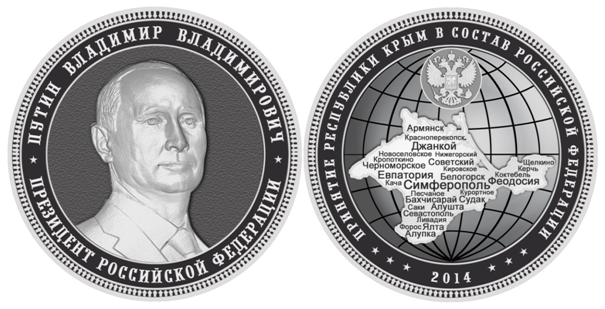 Коллекция «Крым 2014» состоится из 25 серебряных и позолоченных монет, каждая весом 1 килограмм и размером с ладонь. На аверсе монеты изображен барельеф президента России Владимира Путина, на реверсе – контур Крымского полуострова, на котором видны названия некоторых населенных пунктов.