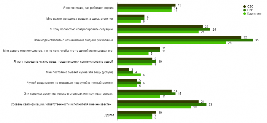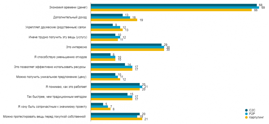 В ходе опроса пользователям было предложено отметить любое число факторов, которые способствуют использованию того или иного сервиса. В качестве примера мы вывели на диаграмму данные по трем наиболее популярным сегментам — торговле вещами между частными лицами (С2С), обмене услугами между частными лицами (Р2Р, фриланс, самозанятость) и карпулингу. Каждый раз учитывались ответы только тех респондентов, которые пользовались данным сервисом в 2019 году.