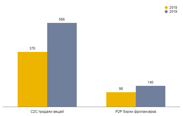 Основной прирост пока дают лишь два направления: обмен товарами и услугами между частными лицами — C2C и Р2Р, соответственно. Поэтому, ввиду значительного разброса абсолютных значений, мы построили не одну, а три диаграммы.