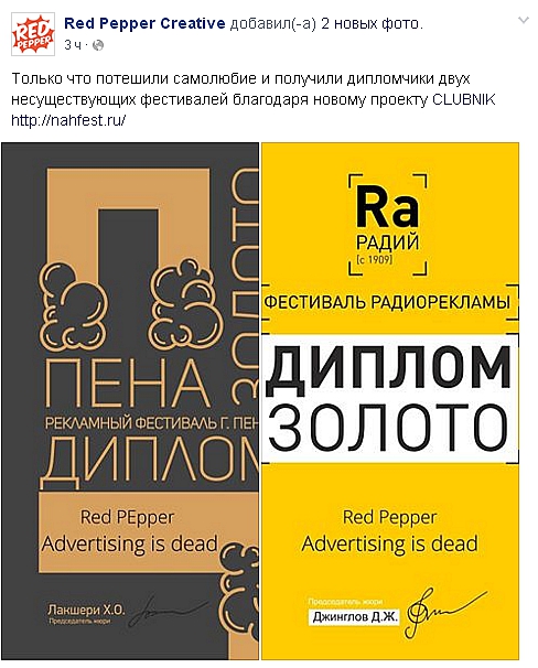О судьбе лишенных фестивального счастья агентств, которые до сих пор не смогли попасть в число лауреатов рекламных фестивалей, задумались рекламщики студии CLUBNIK. В пику "несправедливым" фестивалям они создали альтернативный фестиваль - «НАХ ФЕСТ».