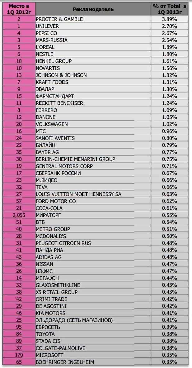 Лидером рынка по итогам января–марта стала компания Procter & Gamble, которая увеличила свои рекламные затраты на 33%. Второе место занимает корпорация Unilever, чей бюджет сократился на 13%. Замыкает тройку лидеров компания PepsiCo, увеличившая долю своих затрат на 16%*.