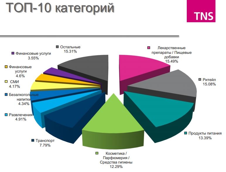 По затратам лидируют рекламодатели категории «Лекарственные препараты/Пищевые добавки», по сравнению с I кварталом 2012 года их бюджет вырос на 20%. На втором месте – категория «Ритейл», которая увеличила показатели на 0,2%, на третьей строчке – «Продукты питания» (+1,8%). Всего на топ-10 категорий приходится около 84,6% рекламного рынка.