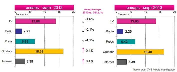 В первом квартале число рекламодателей сократилось на 1% и составило 34 794 компании. Положительная динамика зафиксирована только в наружной рекламе (0,1%) и интернете (0,4%), в остальных сегментах зафиксирован спад. Так, ТВ потеряло 1,6% рекламодателей, радио – 0,1%. Сильнее всего пострадала пресса, где количество рекламодателей снизилось на 4,1%, подсчитали в TNS Россия.