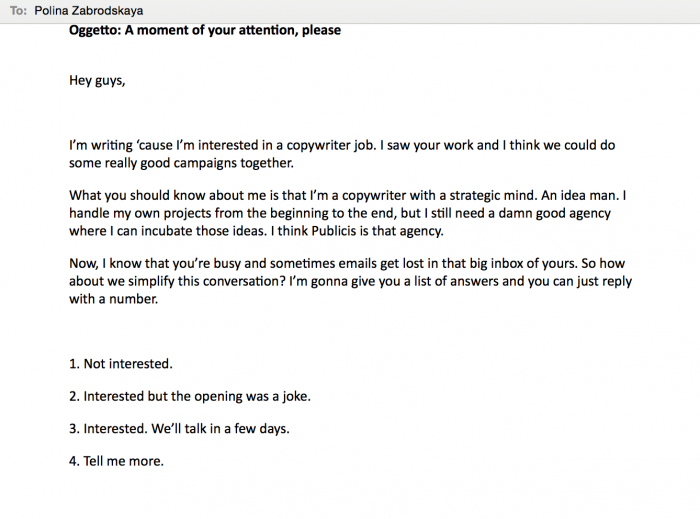 К письму прилагалось отличное портфолио. В этом письме все прекрасно: сохранено чувство собственного достоинства, лесть есть, но очень дозированно, нет креатива ради креатива, и, главное, этот человек нашел настоящий инсайт: на большинство писем не отвечают, потому что нет времени — они всегда приходят в неподходящий момент. Копировать прием подчистую не советую, он отправил тот же текст еще в десяток других агентств, и, насколько я знаю, треть креативных директоров ему ответили, это очень хороший результат.