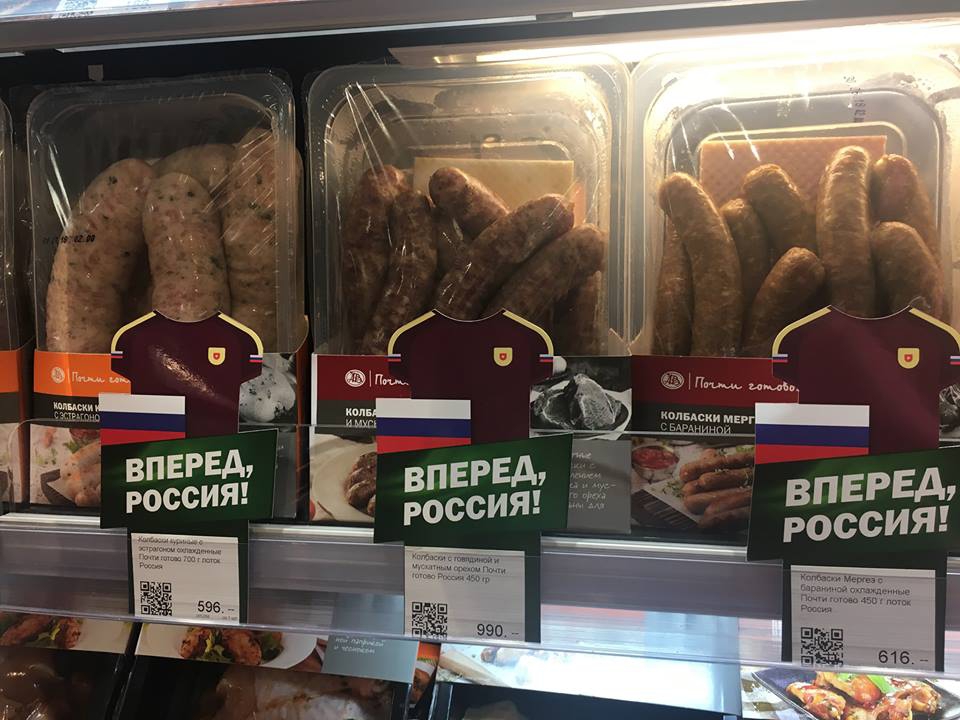 а ритейлер «Азбука вкуса» забрендировал торговый зал триколором и ценниками «Вперед, Россия!»
