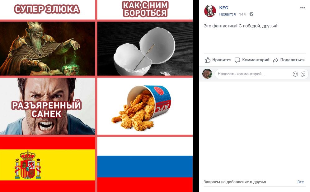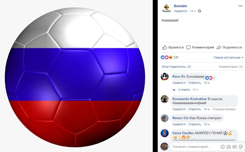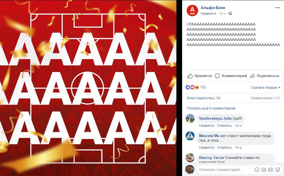 Сбербанк использовал другую популярную тему с обещаниями. Накануне матча с Испанией пользователи массово давали самые безумные и смелые обеты на тот случай, если выиграет наша сборная. Звучали самые разные обещания — от побриться налысо до бросить курить. У Сбербанка этот тренд вылился в рекламу пакетов услуг для малого бизнеса, которые до 15 июля можно подключить всего за 1 рубль.