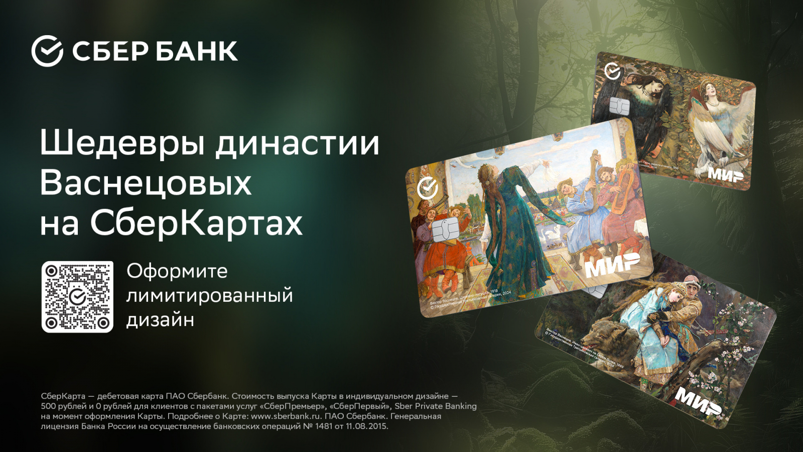 В рамках сотрудничества «Сбер» выпустил банковские карты с лимитированным дизайном, вдохновлённым картинами Виктора Васнецова «Царевна-лягушка», «Иван-царевич на Сером Волке», «Сирин и Алконост. Песнь радости и печали» и Аполлинария Васнецова «Крым. Вид из Ласточкина гнезда», а также вместе с командой СберМаркетинга снял видеоролик для поддержки и продвижения этой коллекции.