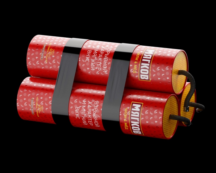 Брендинговое агентство FIRMA разработала лимитированную упаковку для настойки «Мягков. Чили и мед» (компания «Синергия»). При создании упаковки дизайнеры решили "взорвать полку", представив бутылку в виде динамитной шашки. Наливать продукт предлагается из "фитиля" - длинного шнурка с крышкой.