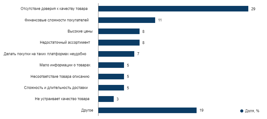 Почему же многие из тех, кто пользуется каналами, ничего там не покупает? Главная причина — это недоверие к качеству товара (29%). Ассортимент, цены, словом, все, на что принято ссылаться в таких случаях, — вторично (по 8%). Заметим, что неудобство совершения покупки, о котором так часто говорят разработчики интерфейсов, стало барьером лишь для 7%. Поневоле закрадываются сомнения в необходимости значительных усилий UX-исследователей, тестирующих сайты. Справедливости ради, отметим: 19% отметивших пункт «другое», это весьма большая доля, а значит, что-то прошло мимо поля зрения исследователей, и тема отказа от покупки в социальных каналах еще не закрыта.