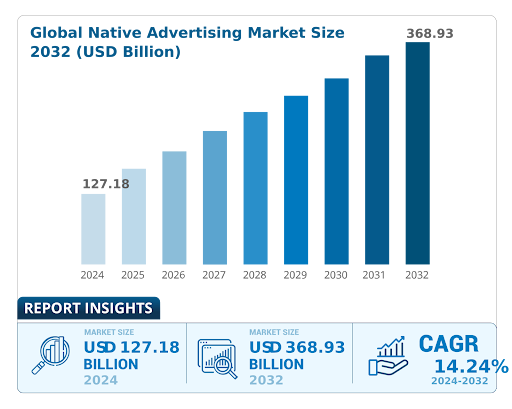 Спрос на нативную рекламу стремительно растет, что подтверждается исследованием Business Research Insights. Согласно данным, объем мирового рынка достиг 127,18 млрд долларов в 2024 году и вырастет до 368,93 млрд к 2032, с ежегодным темпом роста в 14,24%.