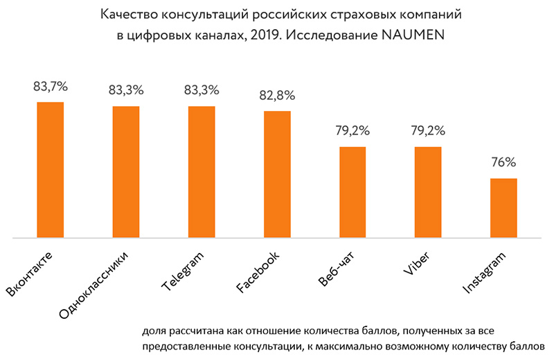 Лучшее качество консультаций среди каналов, в которых количество диалогов было статистически значимым, страховые компании показали в социальных сетях «ВКонтакте», Facebook и «Одноклассники» — более 80%. Быстрее всего страховые компании отвечают во «ВКонтакте» и Facebook, здесь оператор за первые 15 минут отреагировал на более 40% запросов. В Telegram на запрос ответила только одна страховая компания, при этом консультация была оказана на высоком уровне.
