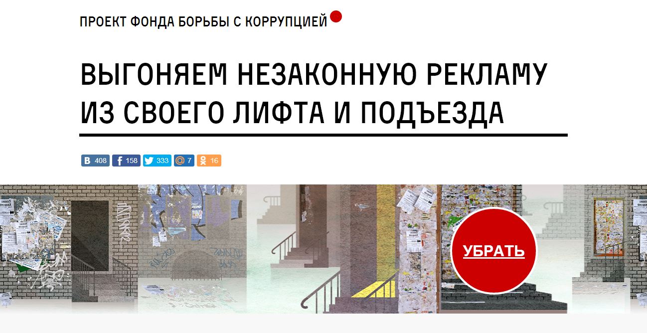 Фонд борьбы с коррупцией совместно с РосЖКХ запустили проект для борьбы с незаконной рекламой в подъездах. На сайте любой пользователь сможет составить заявление, указать адрес, название рекламной и управляющей компании.