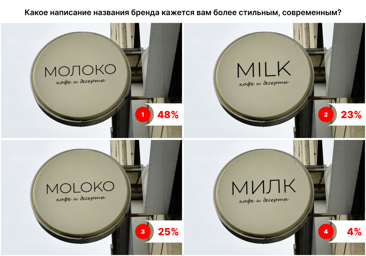 Участникам исследования предложили четыре изображения одной и той же вывески предполагаемого заведения. На фото № 1 название бренда представляло собой русскоязычное слово — «МОЛОКО», № 2 — англоязычное MILK, № 3 — русскоязычное слово на латинице (MOLOKO), № 4 — англоязычное на кириллице («МИЛК»). Респондентов спросили, какой вариант названия им больше всего нравится, побуждает к покупке и воспринимается более стильным, современным.