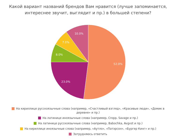 По данным исследования «Анкетолога», название бренда может влиять на восприятие компании и на желание приобрести товар или услугу — об этом заявили 75% опрошенных россиян. 52% респондентов предпочитают русскоязычные названия, 23% — англоязычные. 8% нравятся имена брендов, которые представляют собой русские слова, написанные латиницей, — например, Babochka, а 7% предпочитают иноязычные названия брендов, которые написаны кириллицей, — например, «Бургер Кинг». Затруднились дать ответ 10% опрошенных.