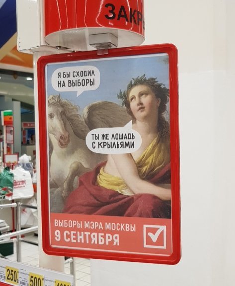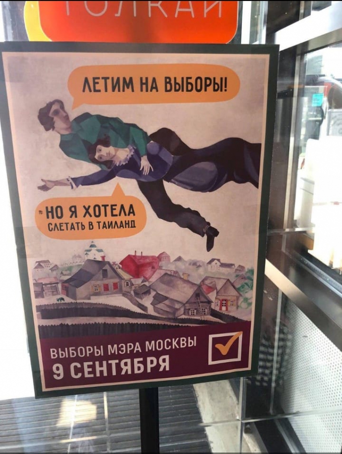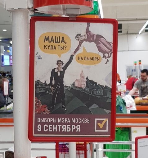 Каково было удивление москвичей, когда в столичных «Ашанах» появились плакаты с картинами Марка Шагала, Рене Магритта и Рембрандта. И это была не реклама выставки в Третьяковке, а кампания с призывом идти на выборы. «Автору удивительно точно удалось передать лёгкое безумие наших выборов», — шутят пользователи Pikabu.