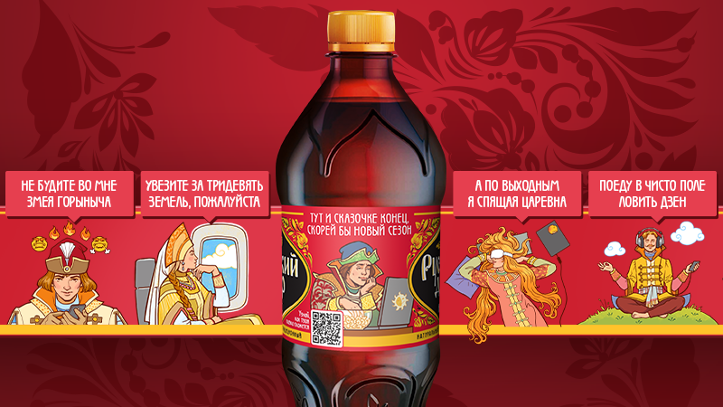 Для этого был использован тренд на персонализацию и разработана лимитированная коллекция бутылок кваса «Русский дар», на этикетках которых изображены герои сказок в современных реалиях и использованы фразы из русских народных сказок, адаптированные под современные инсайты.