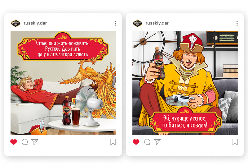 Герои сказок, оказавшиеся в современном мире, легли в основу этикеток новой лимитированной коллекции «Русского дара» (PepsiCo) и постов бренда в соцсетях. Пользователи могли увидеть Царевну на электросамокате или Царевича, который выбирает новые кроссовки, а также узнать на лендинге, как скажется их сказка. Команда агентства