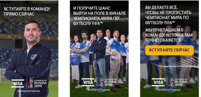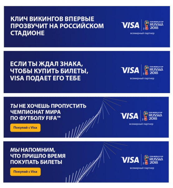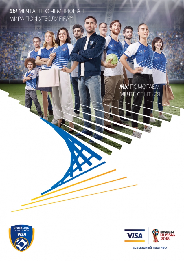 В конце 2017 года Visa запустила коммуникационную кампанию, которая проходила в три этапа. Первый этап пришелся на декабрь 2017 и был приурочен к жеребьевке перед Чемпионатом. В рамках кампании стояли следующие задачи: маркетинговая — стимулировать использование Visa для совершения покупок онлайн и коммуникационная — помочь потребителям не пропустить момент, когда нужно начинать покупать билеты на чемпионат мира. В качестве каналов продвижения бренд задействовал интернет-баннеры и социальные сети.