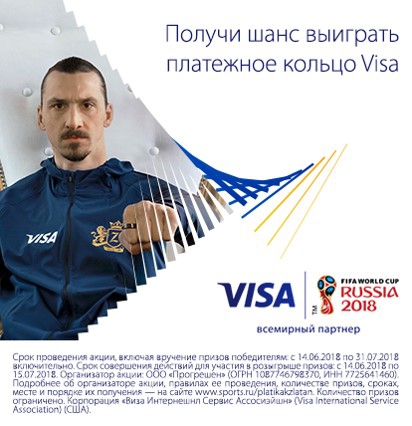 Расплачиваясь картой Visa в магазинах розничной сети «Магнит» и на АЗС «Газпромнефть», клиенты получали шанс выиграть билеты на ЧМ и другие ценные призы с символикой FIFA. Так, участники акции #ПлатиКакЗлатан могли выиграть платежное кольцо Visa — для этого необходимо было разместить селфи, сделанное в гербе Златана, на сайте и поделиться им в соцсетях. Кроме того, в рамках подготовки к турниру Visa провела несколько десятков активностей с банками-партнерами.