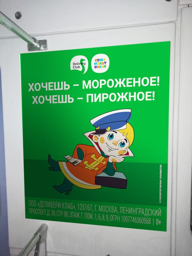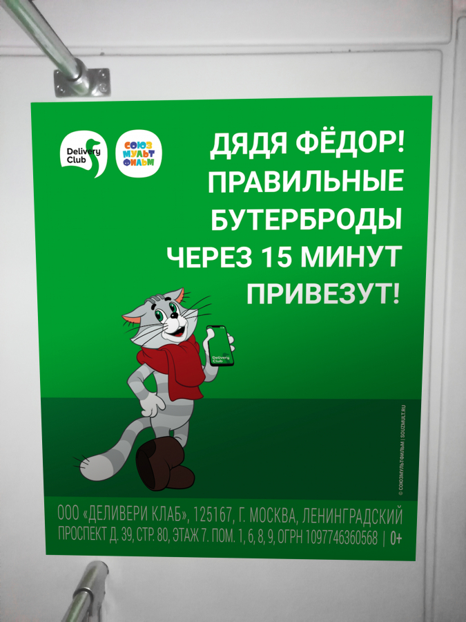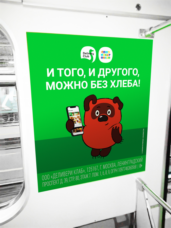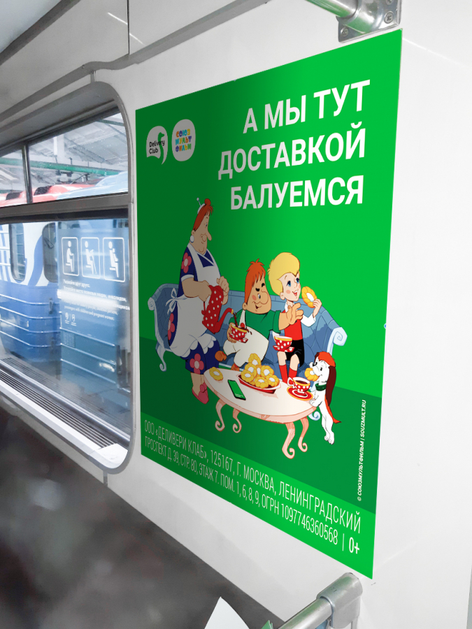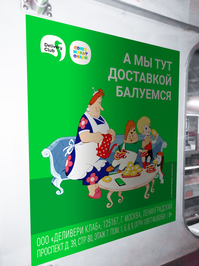 В феврале в московском метро с помощью платформы NEBO.digital стартовала совместная рекламная кампания «Союзмультфильма» и популярного сервиса доставки еды Delivery Club, где персонажи советских мультфильмов воспользовались доставкой.