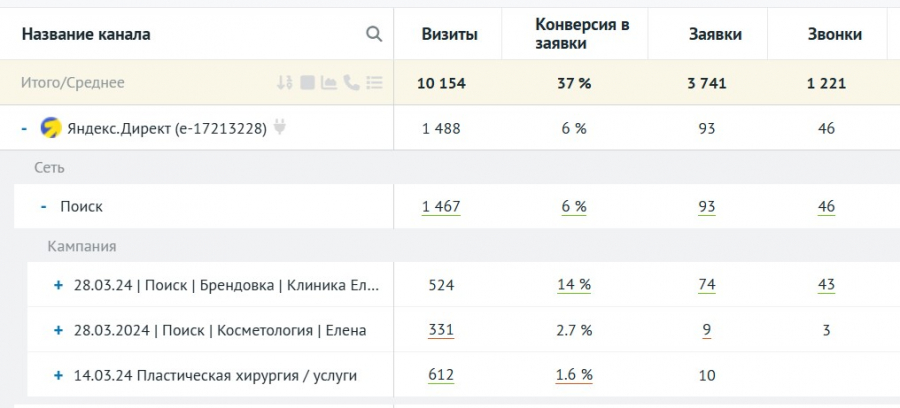 Проанализировав ситуацию, мы выяснили, что 95% лидов и продаж клинике дает брендовый трафик: